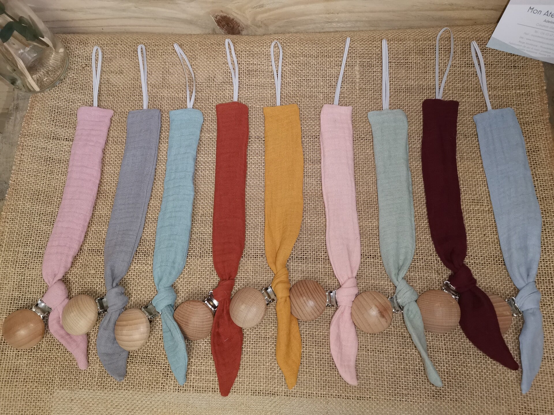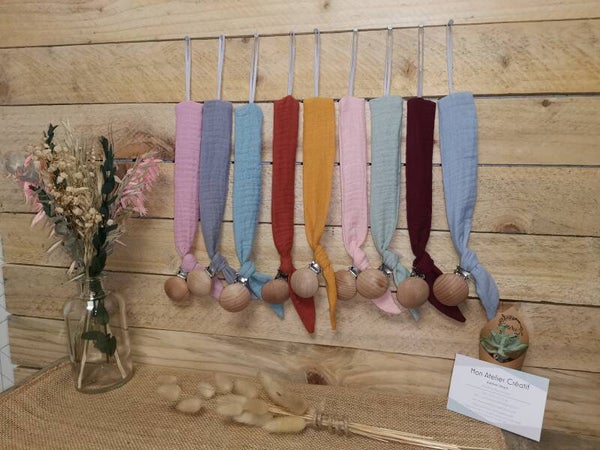 🌿 Matière : double gaze de coton, clip bois de hêtre et élastique